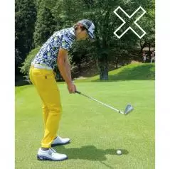 簡単に飛ばせるアイアンを使うと、もっと飛距離を出したいという欲が出て、ダウンスイングで上半身を使って無理やりつかまえに行こうとしている方が多くいます。その結果、右肩が前に出てしまうのです。