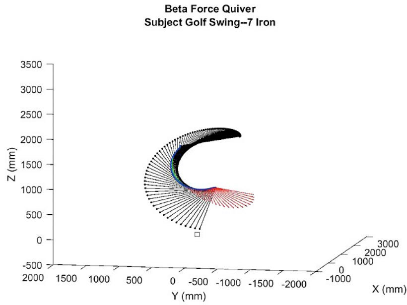プレーヤーがゴルフクラブに与えるエネルギーの実に3分の2が直線運動です。しかも、その大半がグリップエンドを引くγ(ガンマ)フォースの存在です。ダウンスイングに入ったプレーヤーは、左腕が地面と平行のポジションから、積極的にグリップエンド方向へ引くことによりクラブヘッドに回転運動と大きな遠心力を与えます。シャフトが地面と平行(デリバリーポジション)に下りたあたりから、そのフォースの方向はどんどん上空へとベクトルを変化させていきます。当然グリップエンドが指す方向も上空になります。インパクトポジションでは、そのベクトルはむしろ若干飛球線後方へ、プレーヤーの背中側へ向きます。