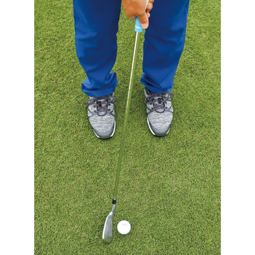 まずグリップを短く持ち、スタンス幅、ボール位置ともにパットと同じにします。次にクラブを吊るように構えます。こうするとボールに近づくのに伴ってヒール側が地面から浮きますがそれでOK。距離が近いほどヒールを浮かせます。