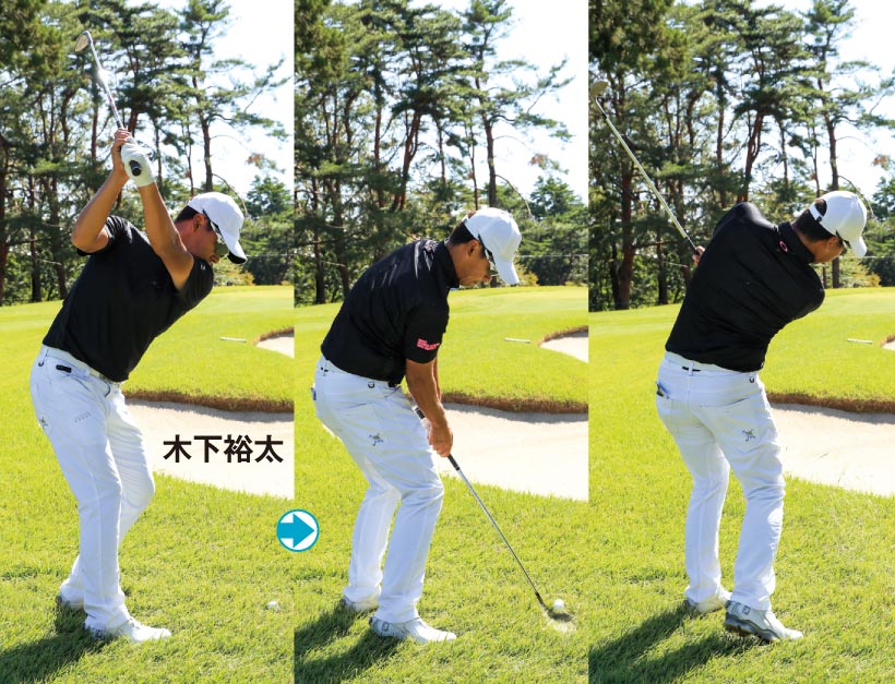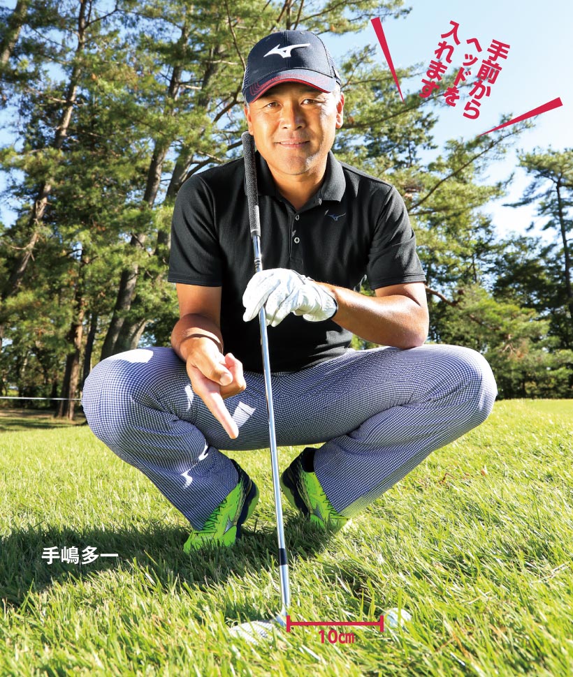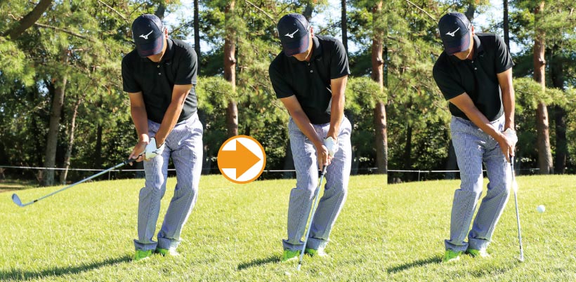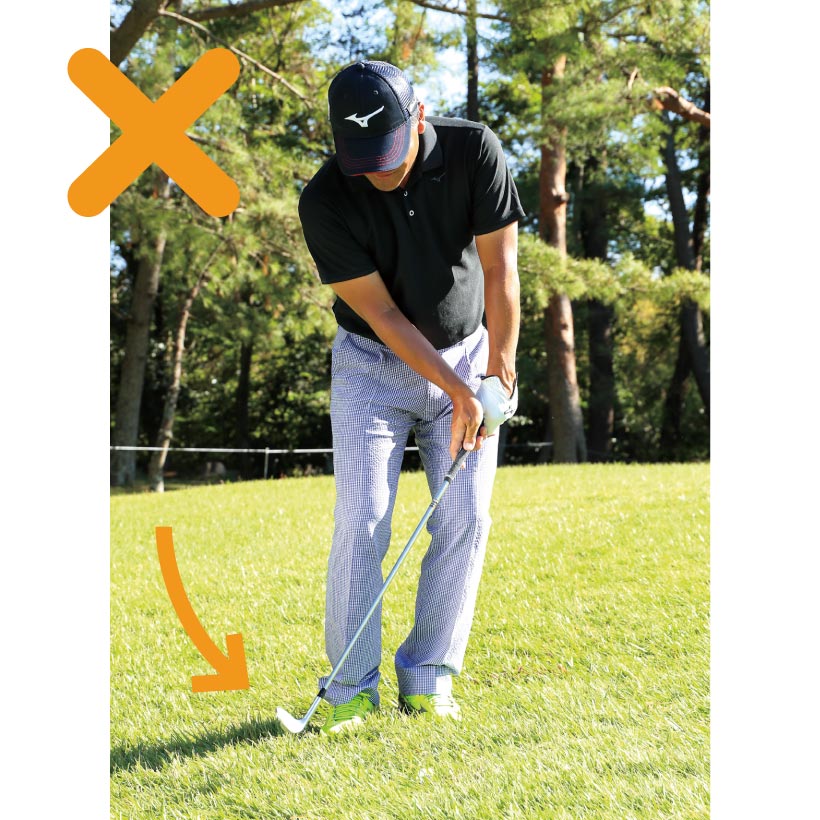 ここで紹介している逆目なら、ボールの10センチくらい手前にヘッドを下ろして滑らせればOK。打ったあともヘッドは低く保ちます。
