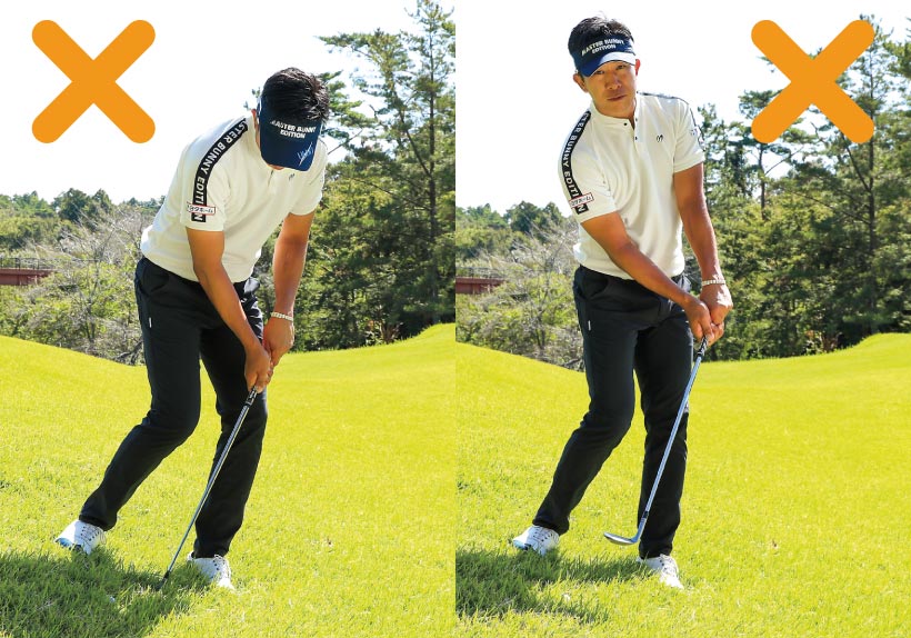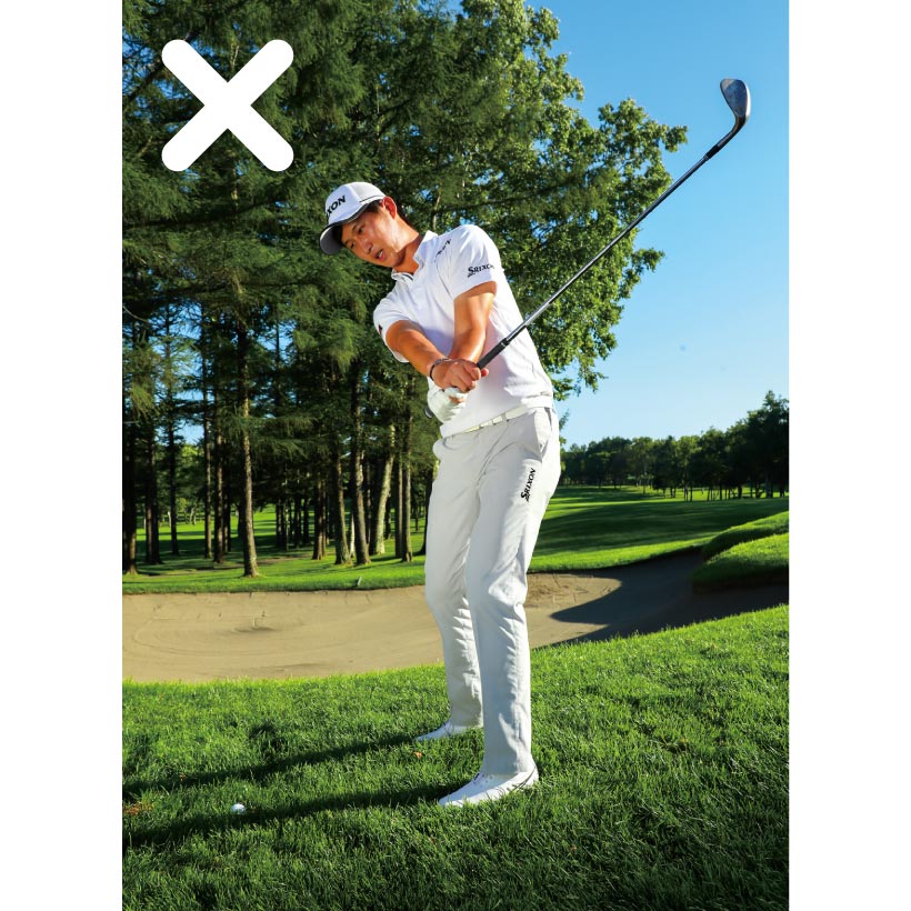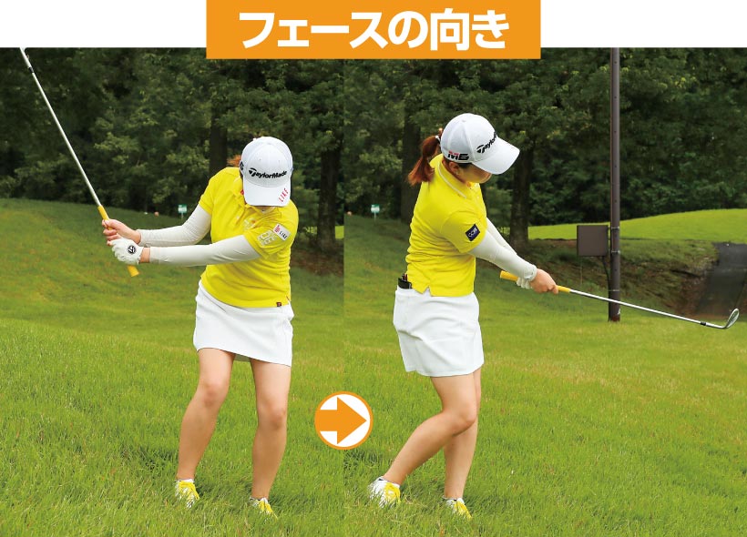 終始左足体重のまま、フェースターンを意識せずダウンスイングで右ヒザを左ヒザに寄せてゆけば、傾斜に沿ってヘッドを低く出せるので、ボールがフェースに乗ってフワッと浮いてくれます。