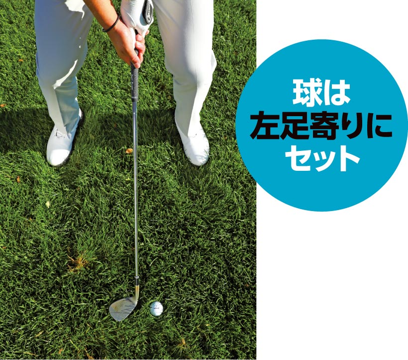 寄せます。ポイントは前に飛ばないようセットアップすること。ウェッジ(ここでは59度)のフェースが空を向くくらい開いたら、それに合わせてスタンスを広げてオープンに立ちます。ボールの位置は真ん中より2個分ほど左。重心を下げて低く構えたら、目線を少し上に向けましょう。