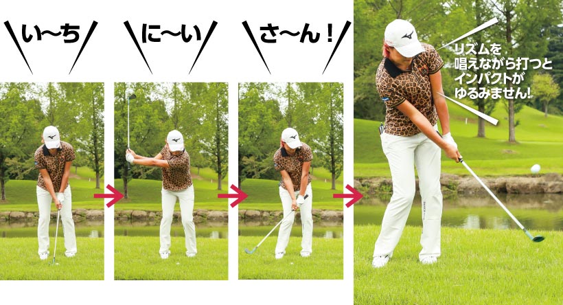 一番いけないのはインパクトがゆるむことなので、素振りと同じスイングで打つことが絶対条件です。ゆるむ時は必ずリズムが遅くなりますから、心の中でリズムを唱えながら振っています。アマチュアの方は打ち急ぐことも多いですが、リズムを唱えればこれも防げると思います。