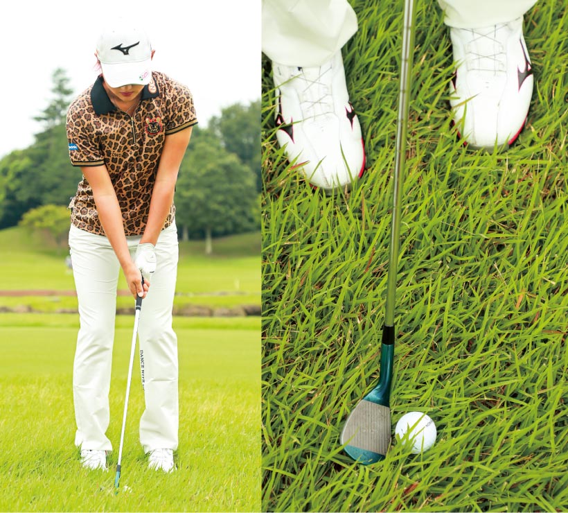 深いラフは状況によって抵抗が変わるので、単純に「この距離だからここまで振る」と決められません。私の場合は素振りで芝の抵抗を感じ、それに見合った強さで振るようにしています。芝の抵抗が強いときのために回転しやすい狭めのスタンス幅で構えます。