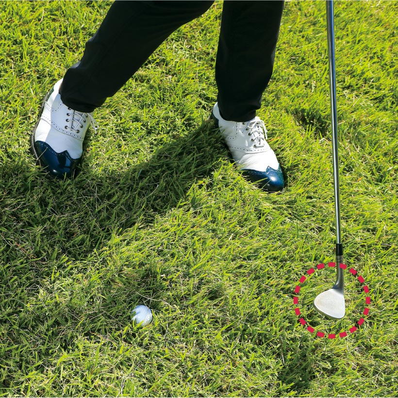 これくらい手前からソールを滑らせて打つ。ラフが長い状況ではグリップ圧を強めにする。