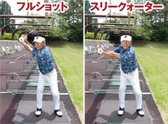 振り幅はその日いちばん気持ちよく振れるスイングが一番ですが、フルショットと、スリークオーターの2種類を試すことができればベスト。アイアンの場合、ティショットなど絶好のライから打つ場合と、傾斜やラフなどフルショットできない場合も多々あります。こういうときの対処法として準備しておくと、焦らずに対応できるはずです。