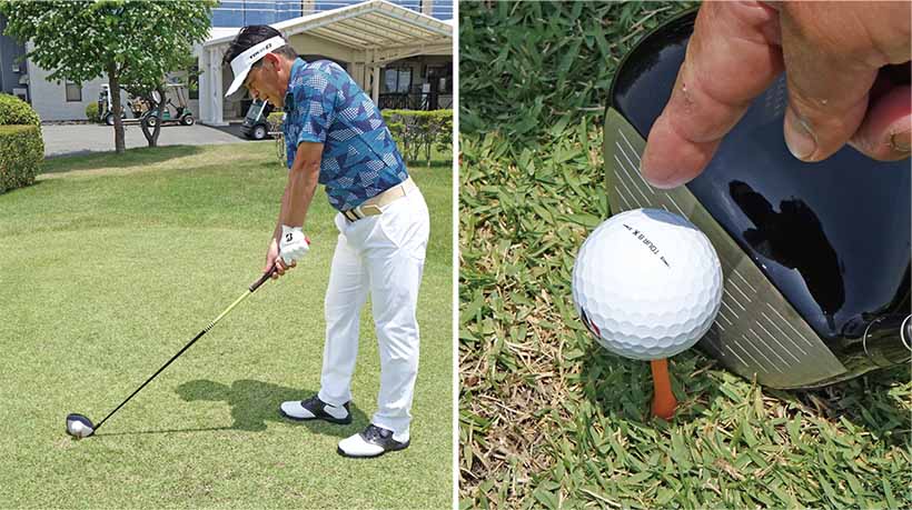 方法は簡単! ボールのロゴなど真っすぐのラインになった部分を、目標方向と垂直になるように合わせてティアップします。あとはそのラインを合わせて、きっちり垂直になるようにスタンスをとり、ヒザや体のラインも正対させればオッケー。