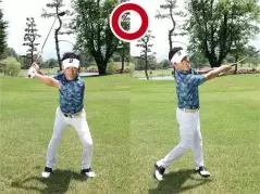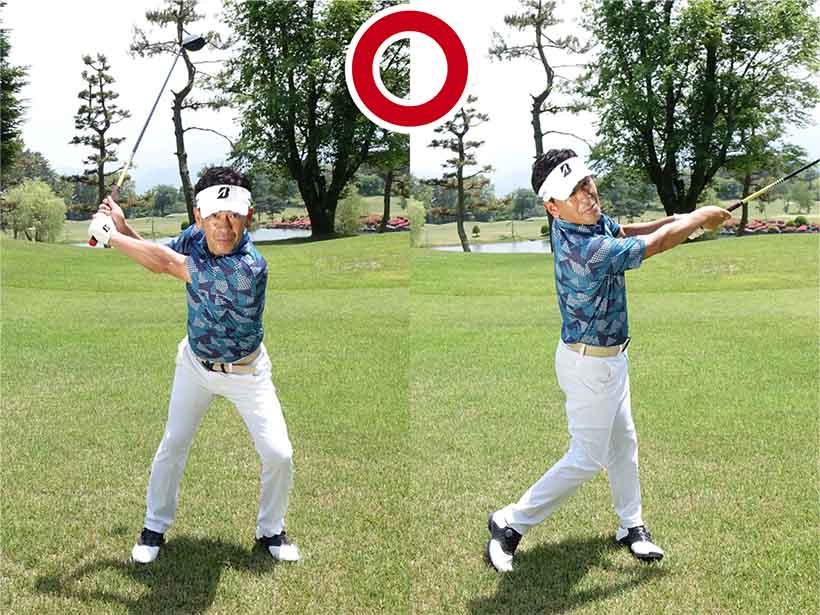 左足体重をキープしたまま肩から肩までのハーフスイングをすれば、構えたところにヘッドがスムーズに戻る!