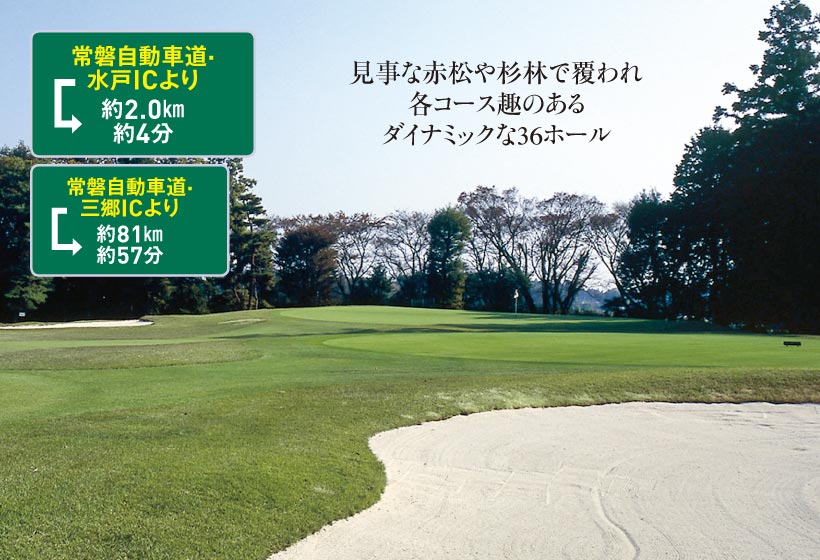 ICから約2㎞とアクセス抜群。赤松や杉でセパレートされた東西、南北の36ホールは日本プロゴルフマッチプレー選手権が開催された雄大かつ躍動感に満ちたチャンピオンコース。