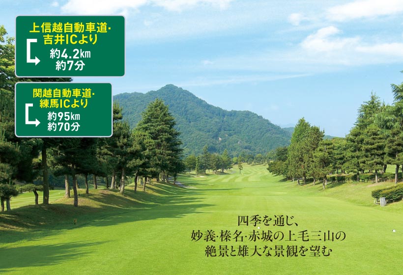 吉井ICから約4㎞と好立地。自然を生かした、カエデ、ケヤキ、サザンカのそれぞれ趣きの異なる3コースから成る個性豊かな27ホールを堪能でき、雄大な景観を望める。