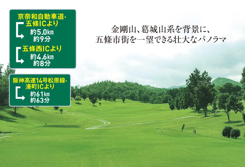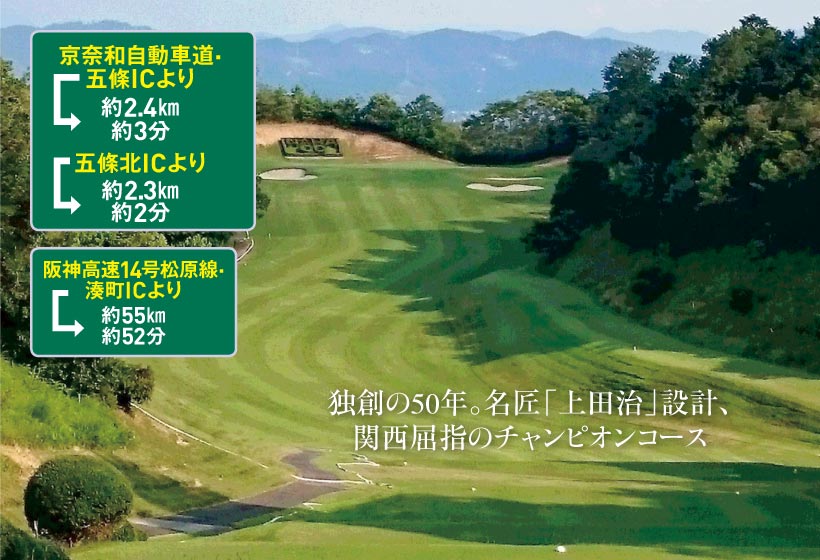 ドッグレッグなどの変化に富んだ戦略的なOUT、フェアウェイが広いホールが多く豪快なINと違いを愉しめるコース。大阪·奈良·和歌山方面からの立地と交通アクセスが良い。