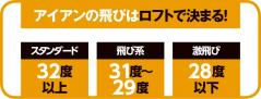 もともとアイアンは番手ごとに飛距離の差が出るようにロフトが変えられています。つまり、アイアンの飛距離はロフトで決まるわけです。7番アイアンのロフトをスタンダード、飛び系、激飛びの3つに分けると次のようになります。