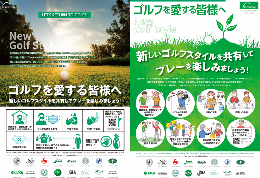 そういえば、ゴルフに関わる16団体が参加している『日本ゴルフサミット会議』がwith コロナのゴルフについてポスター作ってます。なんで2種類作ったのかナゾだけど、せっかくなので2種類並べて載せときます。ゴルフ場や練習場で目にすることがあるかもしれません。