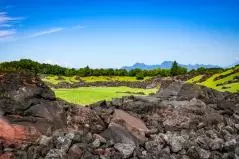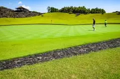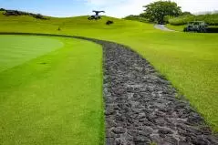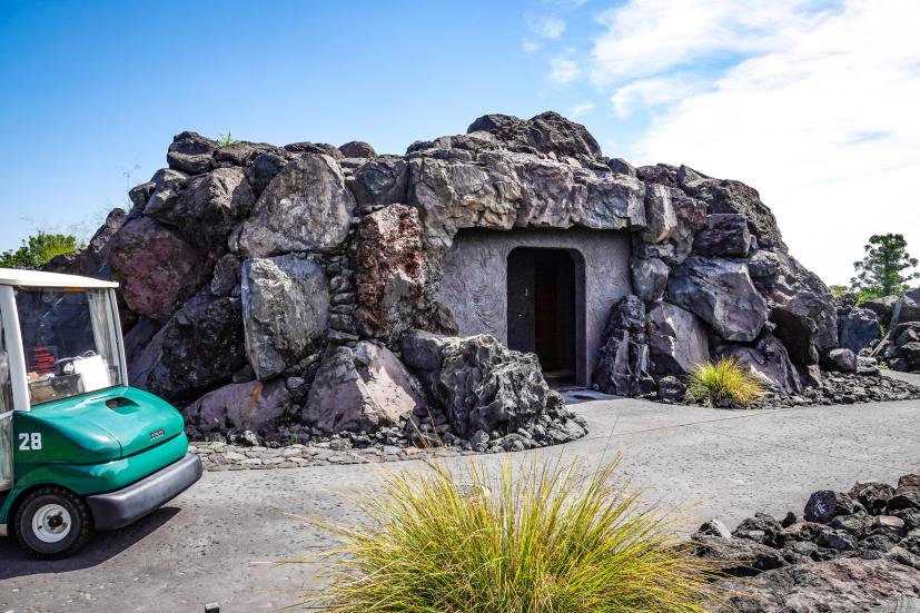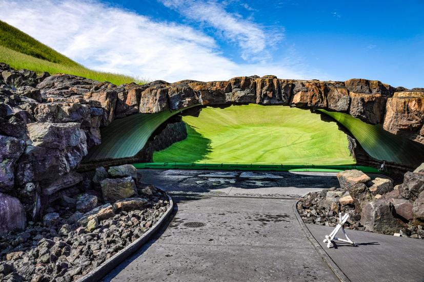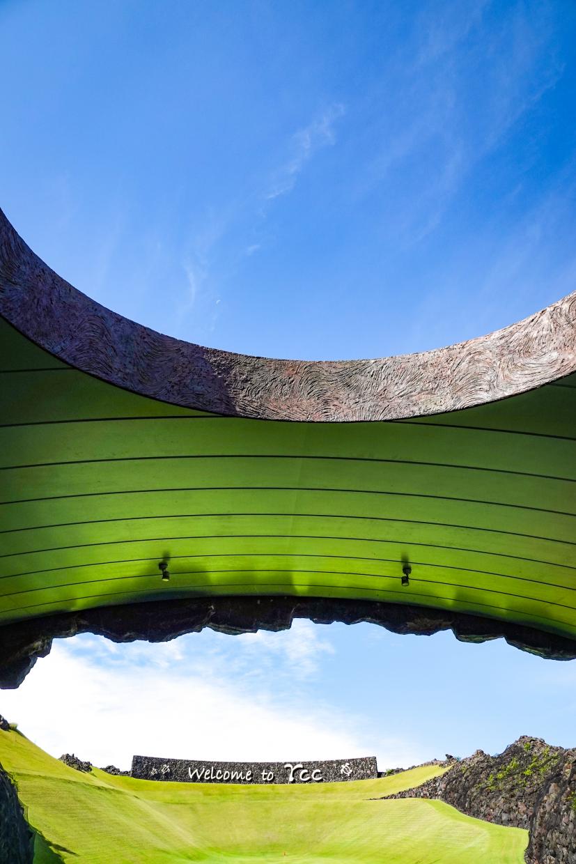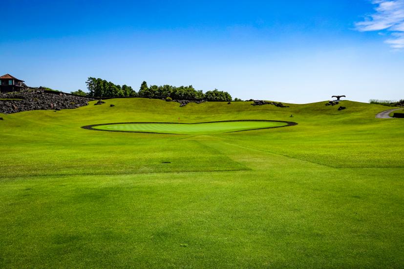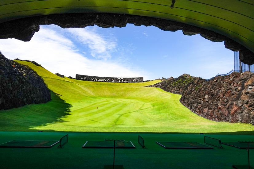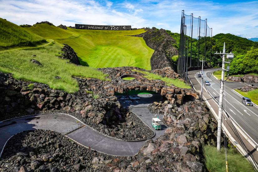ゴルフ場に着く前から溶岩が迎えてくれて、クラブハウスの中も完全にハワイで、期待がどんどん高まったところで練習場です。普段ラウンド前に練習しないというかたも、ぜひ練習場には足を運んでくださいね。すっごいから。度肝抜かれるから。だってこんなだよ。