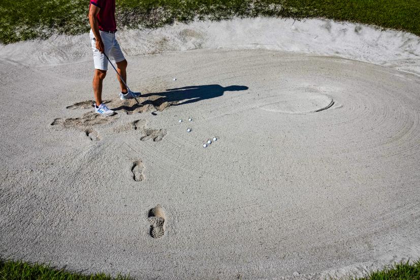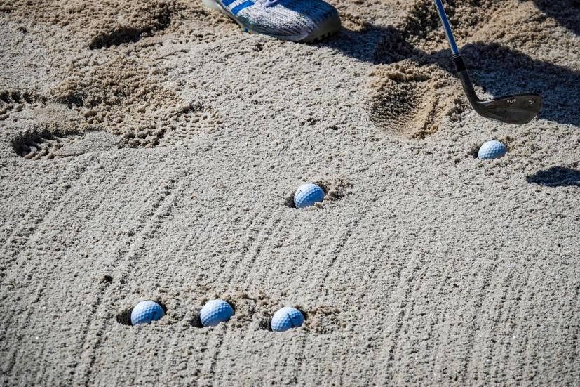 15年ぐらいゴルフやってるけど、人生で一番のふかふかバンカーだった。底なし沼っていうか流砂っていうか、砂に引きずり込まれて体ごと沈んじゃうんじゃないかって心配になるぐらいのふかふかっぷり。だって、足が定まらない。バンカーショットのときって、両足をギュッギュってやって安定させるでしょう。ここでそれやっても足場は安定しません。フワフワの状態で打つのです。