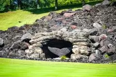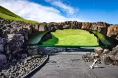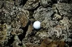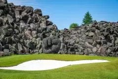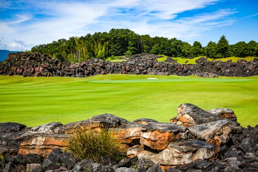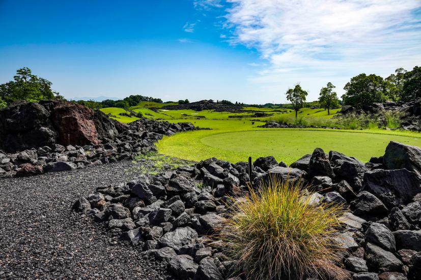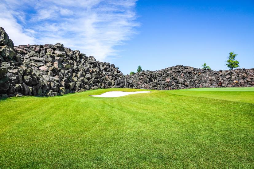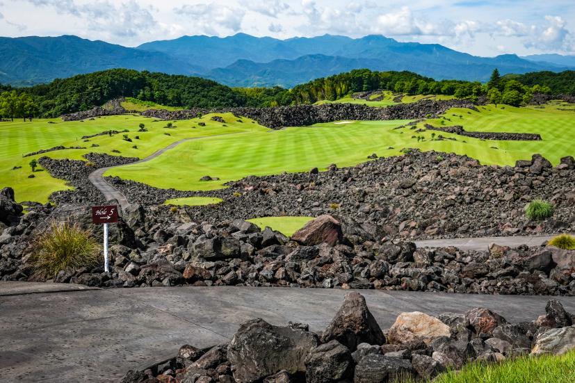 まあこんだけ岩岩に囲まれてたら当然ボールが当たることもあるわけです。ナイスショットしたつもりでも結果的に溶岩OBなんてこともございます。逆に、溶岩に当たった場合は溶岩チャンスが与えられて、好きなとこで使える1マリガン権獲得とか誰かのショットの番手を決められるみたいな独自ルール作って遊ぶのも「当たれー」「当たるなー」のかけ声が錯綜して楽しいと思います。あと、今回は誰もならなかったけど、岩の間に挟まっちゃって取れないこともあり得ます。