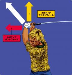 効率的なスイングの切り返しで、主にグリップに与えられるエネルギーの多くはグリップエンド方向へ引くガンマフォースと、シャフトを上空方向へ支えるアルファフォースです(イラスト参照)。実はクラブの重力を支えている分だけ、このタイミングではアルファフォースのほうが大きな数値となります。これら2つのフォース(直線運動)の合成がイラストの白の矢印であり、このベクトルに沿ってクラブヘッドは身体側から飛球線後方へと振り出されていくことになります。その結果、グリップエンドはプレーヤーが積極的に引くことのできるポジションに移動し、アルファフォースは急速に減じる一方で、インパクトに至るまでガンマフォースが主役となります。ポイントは、この切り返し直後のエネルギーが2つのフォースの合成であることです。ニクラスはここをリリースと知覚しているのだと推測できます。このフォースの合成は、観測の結果としては「溜め」として現れます。また、ダウンスイングにおける曲率を増大させ続ける楕円を描く原動力にもなるのです。その意味では、切り返し直後には積極的に飛球線後方へキャスティング(釣りでルアーを投げるような動き)させるのが、知覚表現としては正解ともいえるのです。