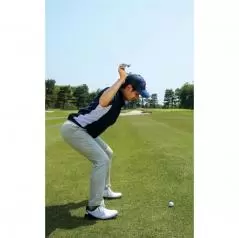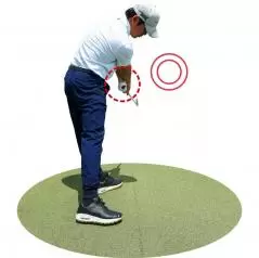 お尻を持ち上げるイメージといっても、腰のすぐ上の背すじが緊張で痛くなるほど力を入れないこと。スクワットするときのように両ヒザを前に出さないで腰を落として骨盤を前傾させるのがコツです。この前傾角度をつくればクラブをダウンブローに振り下ろせるのであって、骨盤が立った構えでは正しい角度から下ろせなくなります。