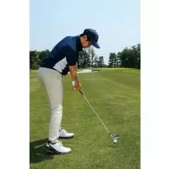 ダウンブローのスイングをマスターするにはアドレスの姿勢も重要です。一番のポイントは骨盤を前傾させること。体重を左右均等に乗せて自然体に近い体勢になり、お尻を少し持ち上げて胸を下に向けるイメージで腰のツケ根から上体を折り曲げて前傾姿勢をつくりましょう。