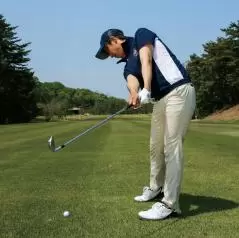骨盤前傾の構えをつくればクラブをダウンブローに振り下ろせる。
