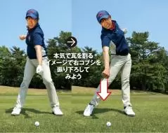 重要なのはパワーのベクトルをボールに向けること。地面に瓦があるとイメージし、空手の突きのように右腕を真下に振り下ろしましょう。ダウンブローのインパクトはそんな感覚です。