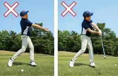 左手首が掌屈してフォロースルーへと向かうと、フェースターンが自然に行われます。右手首は左手首と連動して背屈するのが正しくて、掌屈はNGです。フォロースルーの形を飛球線の後方から見るとグリップエンドが見えれば最高です。鏡などでチェックしてみましょう。