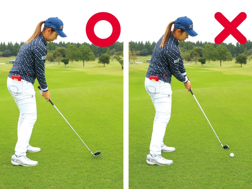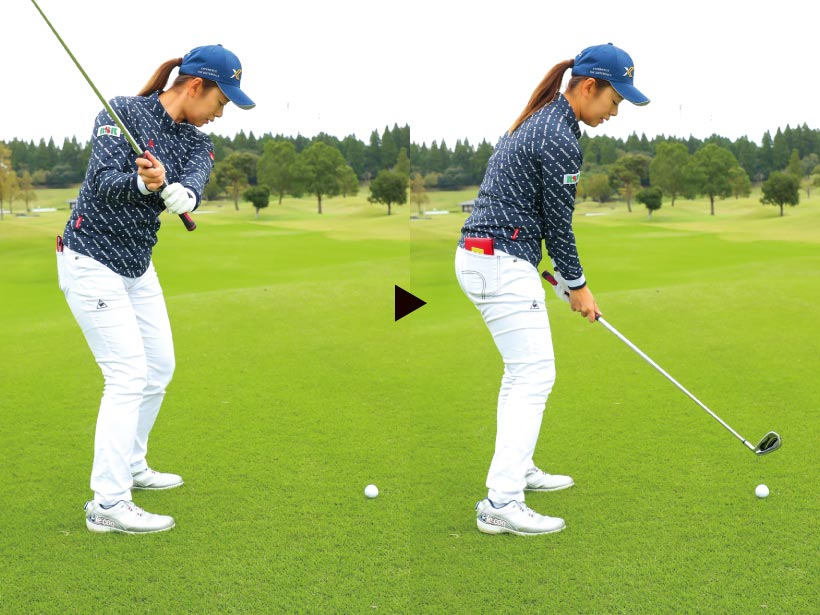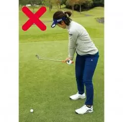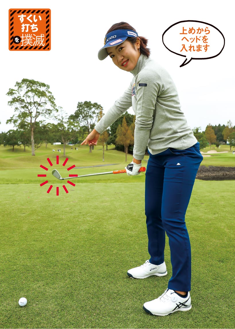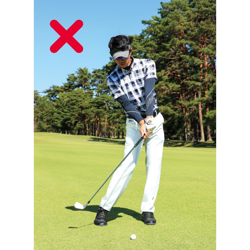 これを直すには、例えば右腕が地面と平行になるくらいの低いフォローを作り、そこに振り出すつもりでスイングします。低い位置に振り出すには、すくい打ちは不都合。自然とダウンでヘッドがある程度上から入るようになります。私はこのやり方で、ダウンスイング時のヘッドの通過位置を確認し、そこを通すイメージでスイングしています。