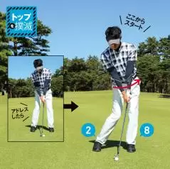 トップの主因は体が伸び上がること。やりたいインパクトと現実がかけ離れています。なので、撲滅には打つ前にやりたいインパクトを作っておくのがオススメ。アドレスしたら、その場でインパクトを作りましょう。イメージだけでなく、左足に体重を乗せて腰も左に回し、ガチのインパクトスタイルから始動します。