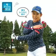 起き上がるということは左肩が浮くということ。実際そうなっていることが多いので、左肩を低くキープして振るのがポイントになります。ただ、過度に低くなると突っ込む動きにつながるので、左肩をレベルにターンさせるように心がける。この方が、体の回転も止まらないので、ボールがしっかりつかまると思います。