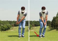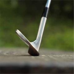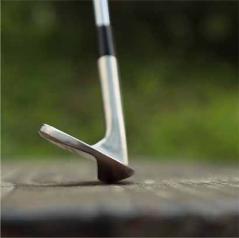 ソールを硬い地面につけて、シャフトを垂直にした状態からシャフトを傾けてフェースを立ててみましょう。そうするとリーディングエッジが地面につきます。この状態でインパクトするのなら、ソール(バウンス)を使わずにボールをヒットするということになります。