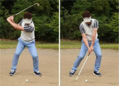 2つの打ち方の違いを見てください。わかりやすいように極端に変えていますが、ローバウンスはハンドファーストに構えて、ボールを上からヒットする感覚で、出球は低くなりました(上の写真)。