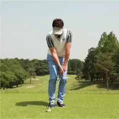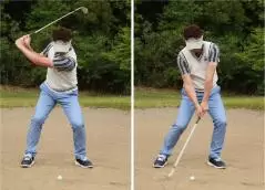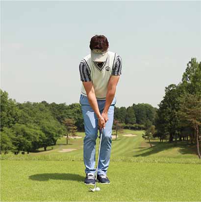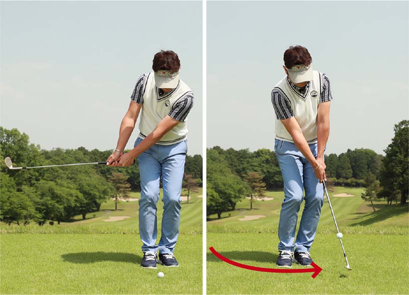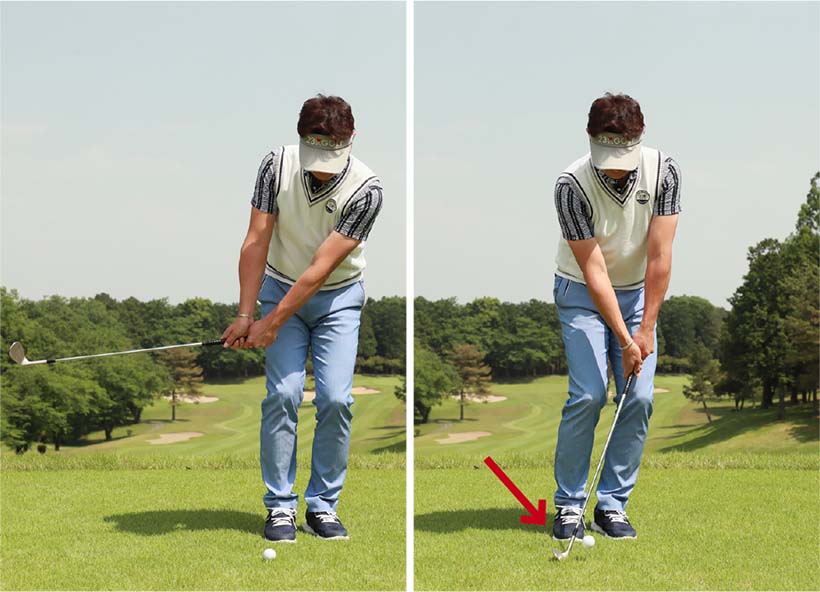 2つの打ち方の違いを見てください。わかりやすいように極端に変えていますが、ローバウンスはハンドファーストに構えて、ボールを上からヒットする感覚で、出球は低くなりました(上の写真)。