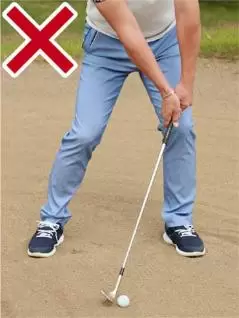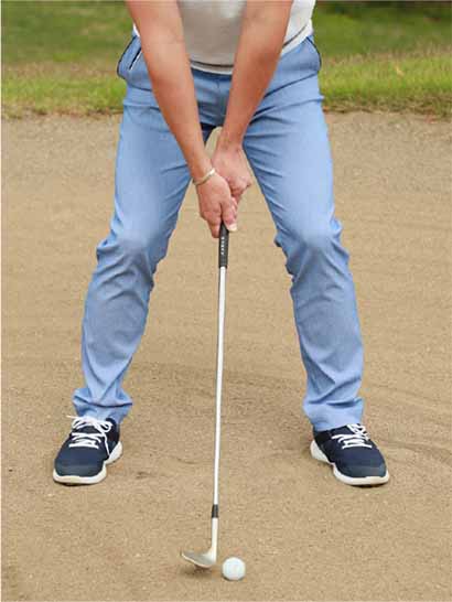 バンカーショットではハンドファーストに構えるのは避けましょう。インパクトでリーディングエッジが先に下りて砂の深くまで潜ってしまい、クラブヘッドが抜けなくなるためです。バウンスが使えず、砂の爆発力も引き出せません。そのため、バンカーからの脱出を難しくしてしまうのです。