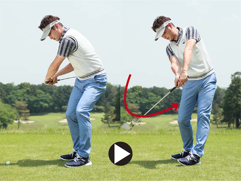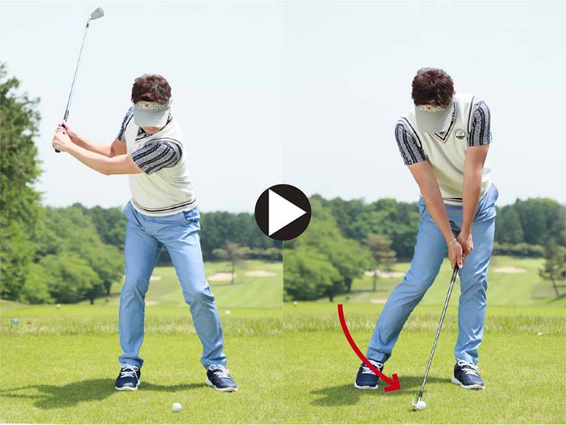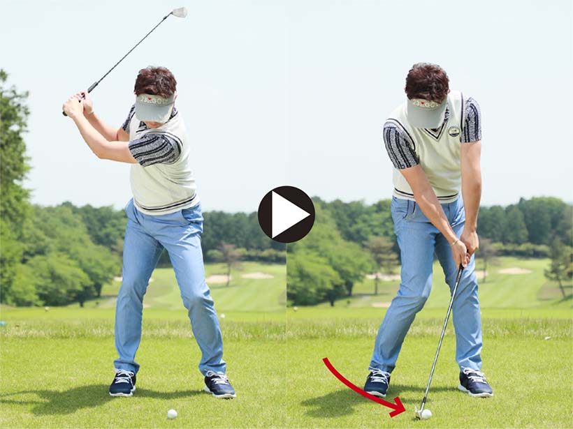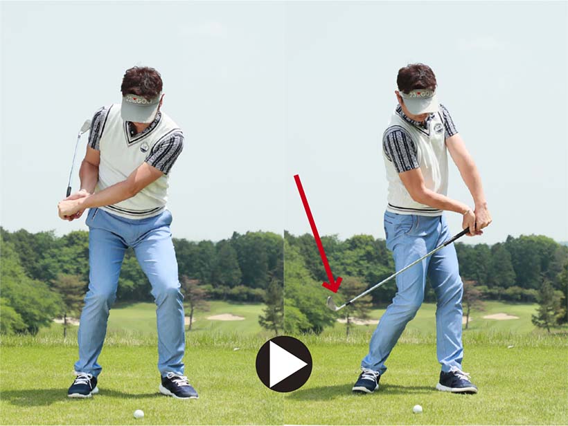 注意したいのはダウンスイングで左ワキがあかないようにすること。左ワキを締めて体の回転と連動させて腕を振り下ろすことが大切です。