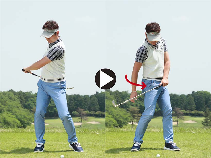 それに対して、今のダウンブローは横の体重移動をあまり使いません。構えた位置のままで体を回転させて、クラブの遠心力にまかせて打つという感覚です。私はよく「引き込み動作」という表現で説明するのですが、要は自分は動かないでおいて、体の回転でクラブを引っ張り下ろすイメージでダウンスイングするのです。昔よりも体も回転を主と考えたスイングといえば理解しやすいでしょう。