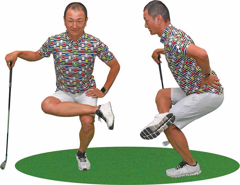 右足を左の太モモにかけて、お尻に少し痛みを感じる程度まで腰を落とす。クラブや柱などで身体を支えながら行うといい(左)。腰を落とした状態で30秒ほど静止。筋トレではなく伸ばすことが目的なので左右1回ずつ行えば十分(右)。