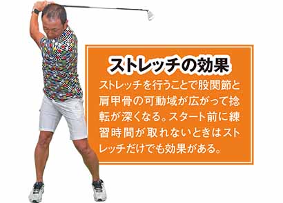 練習を始める前にこの2つをしておけば、バックスイングを深く回すことができ、最初から100%の力を出せるようになります。