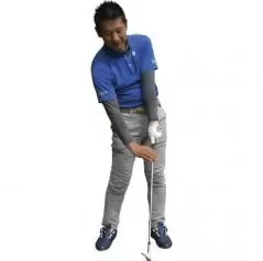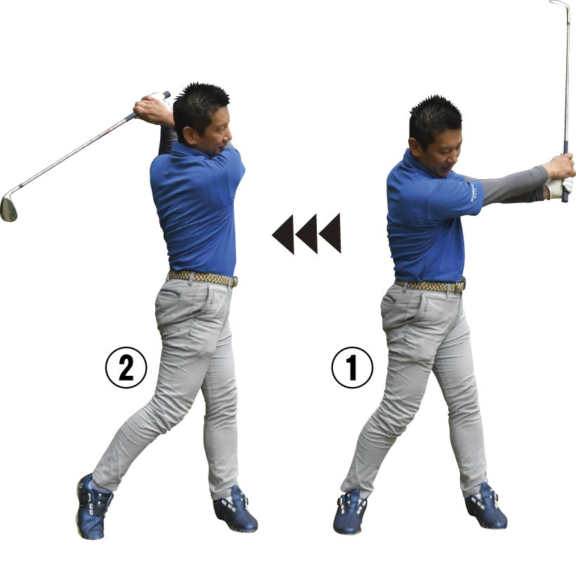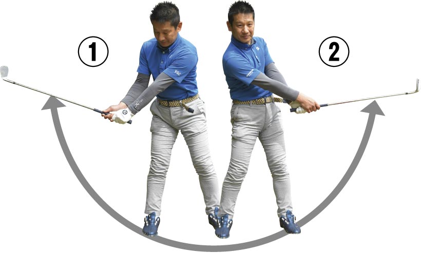アドレスした状態から腕を伸ばしたままクラブを垂直に持ち上げ、体を回るところまで左に回す。そのままヒジをたためばきれいなフィニッシュの形になります。