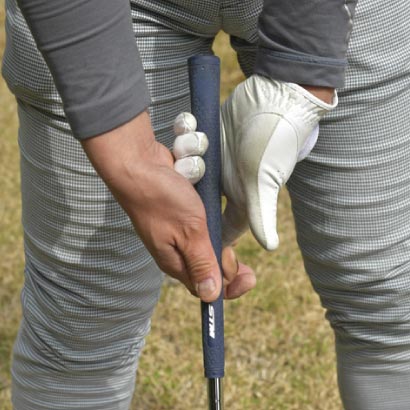 右腰から左腰の高さまでのハーフスイングで強い球を打てるようにすれば、フルショットが安定します。ポイントは体の回転を使って球をつかまえることです。手で打ちに行くとヘッド軌道が安定しません。私の場合は、とくにダウンスイングで力が入ったときに、ヘッドが下から入って右手で返してフックになるクセがあります。そうならないようにするため、クラブが抜けない程度にゆるく握り、スイング中のグリッププレッシャーが一定になるように気をつけています。