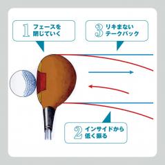「この〝フックで飛ばす〟という練習が、ホーガンの飛ばしの原点です。フックを打つには、まずクラブフェースを閉じて当てるイメージと、インサイドからヘッドを振って、後ろからボールを叩く感覚が必要になります。