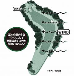 皆さんに風についてのとっておきのアドバイスを送るとしたら、迷ったら「基本の風向き」を信じるのが一番間違いは少ないということでしょうね。基本の風とはコースの上空を吹き抜ける風向きです。同じホールでもロケーション次第でティーイングエリアとセカンド地点で風向きが変わることがよくあるけれど、その場その場で高い木の枝がどう揺れているか、雲がどの方向に流れているかなどを見て判断するのがベストだと思います。