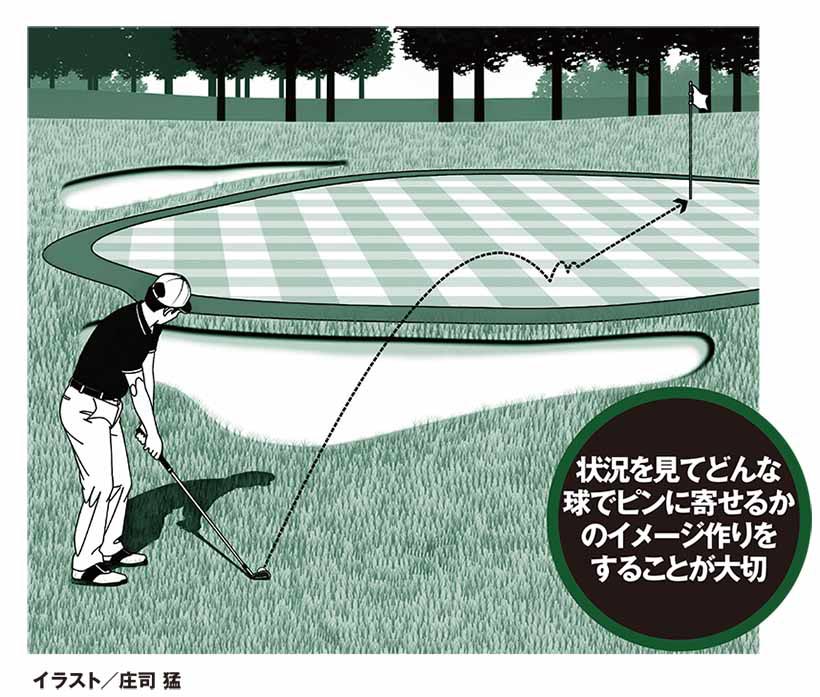 アマチュアの人たちが距離感をつかめないのはピンしか見ないから。どのクラブを使って、どんな球でグリーン上のどの辺に落とせばグリーンの傾斜に乗ってピンに近づいていくか。こんな具合に飛んでいく球を映像的にイメージしましょう。その通り打てるかどうかは別にして、ショット前にアプローチのイメージ作りをする習慣づけが大事なんですよ。