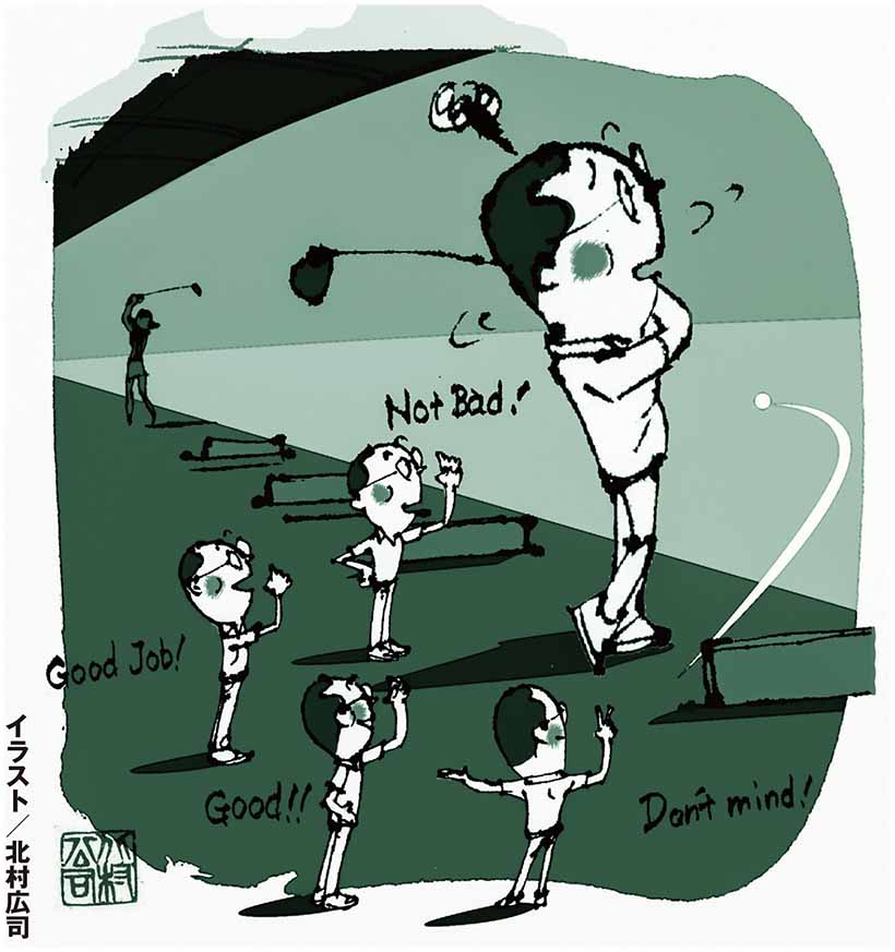 女性のエージシュートもすごいのですが、その方の練習を見ていると、自分を褒めまくっています。ちょっと曲がっても「いい球が打てたわね~」とか、ダフリが出ても「今はフィニッシュがとれたわね~」などと自分に語りかけて、気持ちよく球を打っているのです。自分のできた物事にちゃんと目を向けることができているわけです。