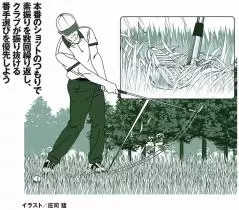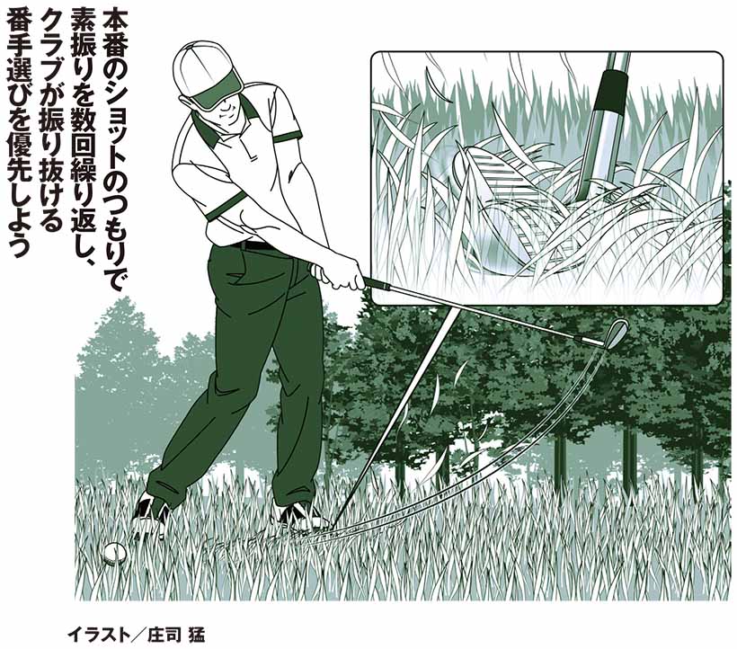 ラフからのショットでは打ち方などの技術面より、ラフにうまく対処するための考え方が大事だと思います。ボールがラフの芝にどのくらい沈んでいるかで使うクラブや攻め方が変わりますが、重要なのはショット前の素振りでラフの芝の抵抗の強さを必ずチェックすること。ボールの近くのラフで本番のショットのリハーサルのつもりでクラブを数回振るのです。