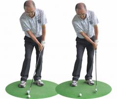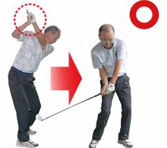 練習の一番の目的は自分のタイミングで打てているかどうかを確認することです。チェックポイントはクラブを上げたときの手の位置。歳をとるとだんだん手が上がらなくなり、ラクをしようとしてトップの位置が知らず知らずのうちに低くなるので、クラブが下りてくるタイミングが合わなくなります。シャフトが寝て下りてきたり、クラブが遅れるぶん手首を余計に使ったり、トップが低くなっていいことはありません。
