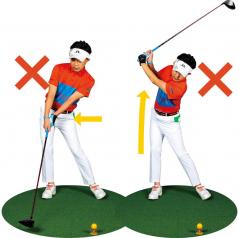 バックスイングで腰が右にスエーする、あるいは体が伸び上がるとダウンスイングで右足体重になり、いわゆるギッタンバッコンのスイングになる。インパクトでフェースが開いてプッシュアウトやチョロするだけでなく、チーピンが出ることもあります。