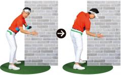壁の角や太い柱の前に立ち、右ヒジを曲げて右手のヒラを壁に当ててアドレス姿勢をとったら、インパクトするイメージで動きましょう。腕で押している人はインパクトが点になっています。