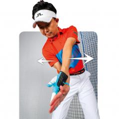 腰を左に回し、下半身で押す形になるのがインパクトの理想形。この動きがスイングに反映されると手打ちが改善、スイング軌道も修正されインパクトがゾーンになってきます。練習やラウンド前のウォームアップとしても効果的です。