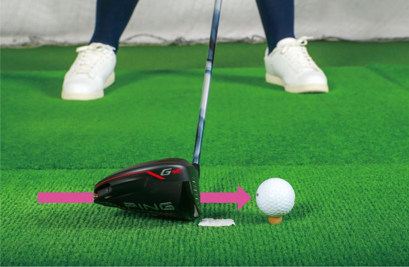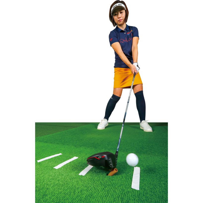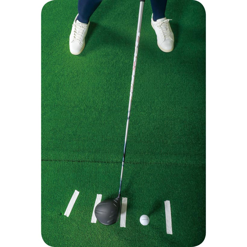 ポイントはボール手前からソールを滑らせるイメージで打つこと。ボール右のマットに貼ったテープにヘッドを着地させ、そこからレベル、もしくは緩やかなアッパーで打ち抜きましょう。