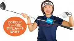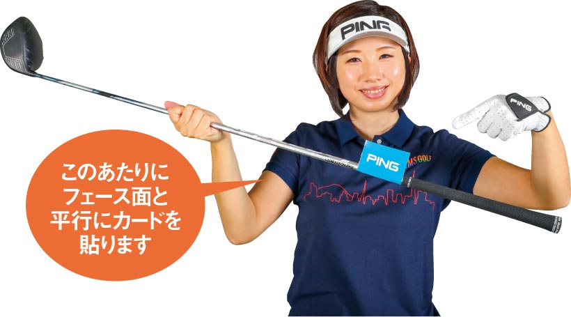 フェース面の管理をするドリルです。何でもいいのでカード状のものを用意し、フェース面と平行になるようシャフトの手元側に貼ります。遠くて感じづらいフェース面を、卓球のラケットのように近づけるわけです。